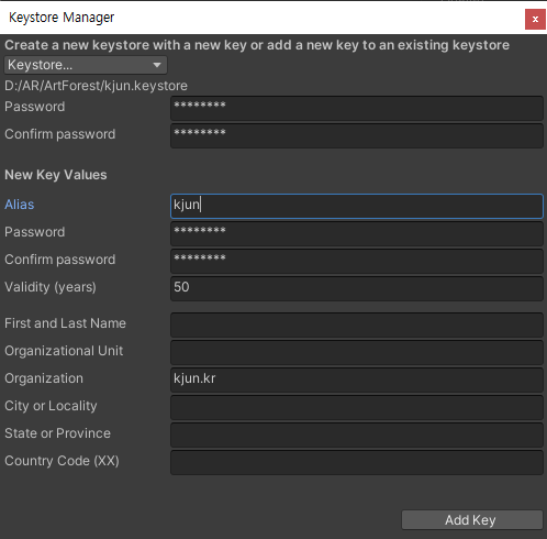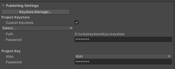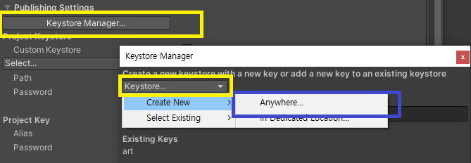 Publishing Settings 에서 Keystore Manager.. > Keystore.. > Create New > AnyWhere