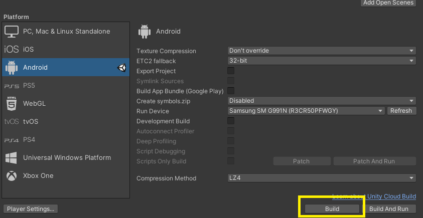 Build Setting 에서 Build 를 클릭하여 이름을 정하고 빌드하면 apk 파일이 만들어 진다.