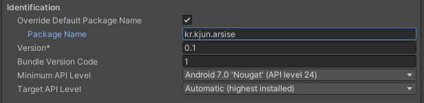 Other setting 의 Identification 에서 Override Default Package Name 를 체크하고 Package Name 을 정하고