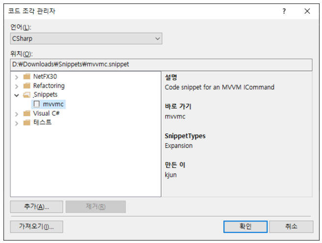 추가 클릭하여 snippets 파일이 있는 폴더를 선택합니다.