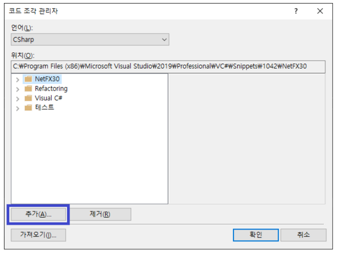 Visual Studio 의 도구>코드조각관리자 진입합니다.