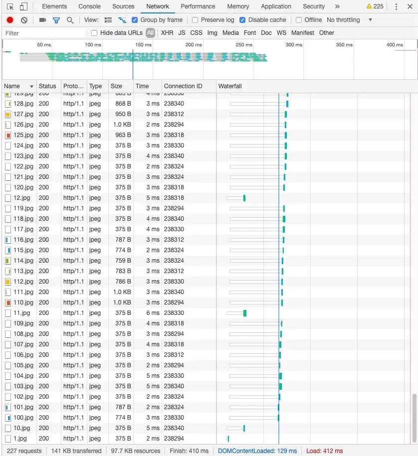 톰캣 8.5 버전에서 HTTPS와 APR을 설정하고 와탭 로고를 225개의 이미지로 나누어 이를 전송하는 WAS를 만들었습니다. 그리고 톰캣 서버는 로컬 VM에서 설치되어 있기 때문에 육안으로도 성능 차이를 가늠할 수 있게 하기위해 강제로 네트워크 쓰로틀링을 걸어 레이턴시를 30ms로 설정하였고고 브라우저 캐싱 기능을 껐습니다. HTTP/2를 위한 톰캣에서의 Tomcat Native 설치와 아래와 같은 커넥터 설정이 전부입니다. 그럼 브라우저에서 H2를 지원하면 H2로 통신이 되고 그렇지 않을 경우 H1으로 통신이 됩니다.