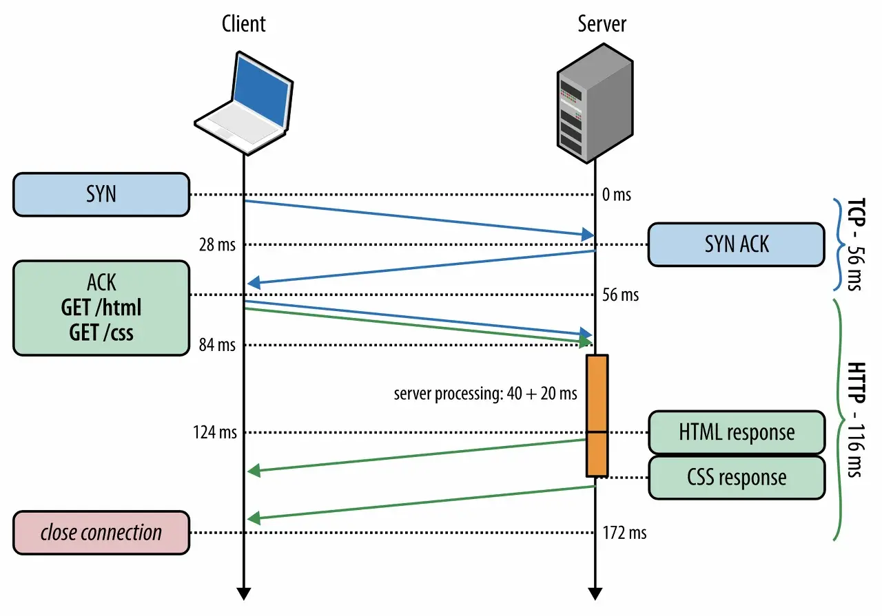 HTTP/2(이하 H2)와 HTTP/1.x(이하 H1)와의 가장 큰 변화는 속도 향상입니다. H1의 성능 저하 부분과 비효율적인 것들을 개선되어 탄생한 것이 H2라고 생각하면 쉽습니다. H1에서 문제가 되는 부분을 보고 H2에서는 어떻게 해결하였는지 보겠습니다.