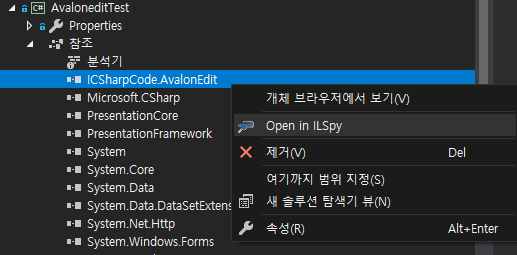 설치가 끝나면 프로젝트를 열어 참조 중 하나를 우클릭하면 'Open in ILSpay' 메뉴가 보이고 이를 클릭하면