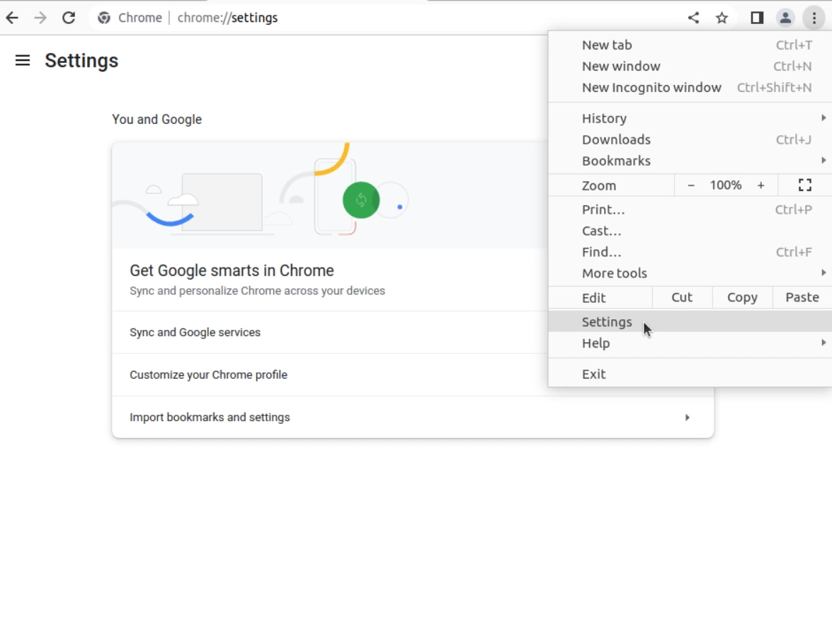 크롬을 열고 아래 처럼 Settings 로 진입