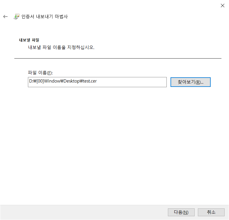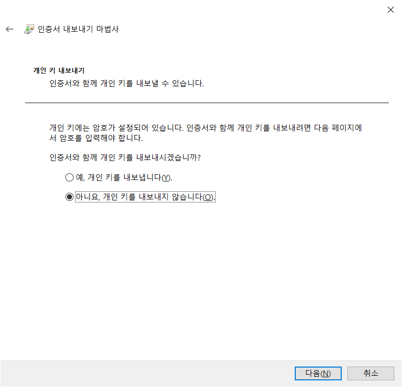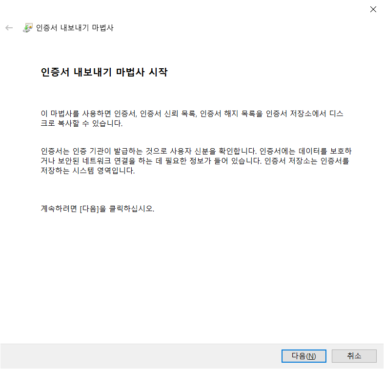 발급대상 목록중 하나를 선택하고 "내보내기" 선택하면 인증서 내보내기 마법사 창이 열림