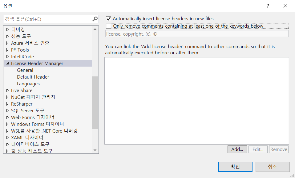 이제 적용할 프로젝트나 솔루션 우클메뉴의 License Headers>Add Solution-Wide License Header Definition File 를 선택하여 licenseheader 파일을 추가해준다.