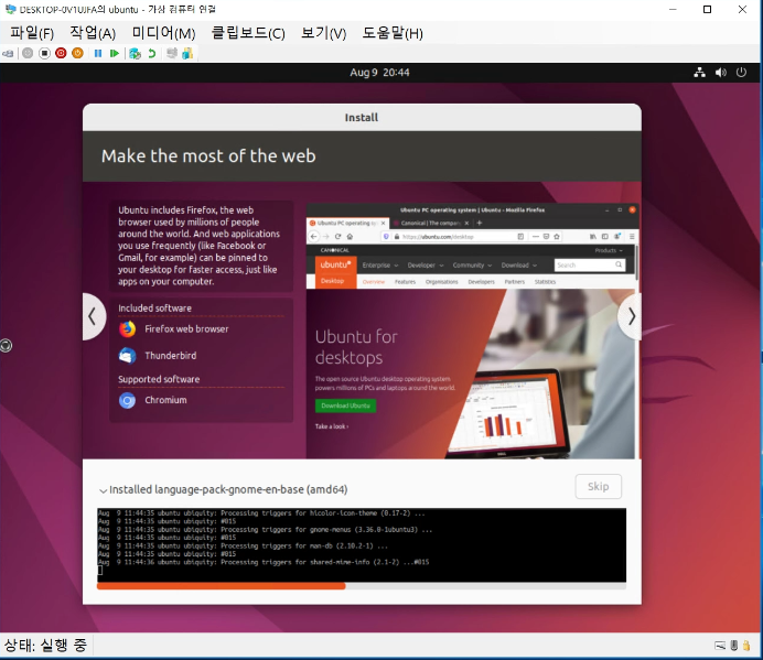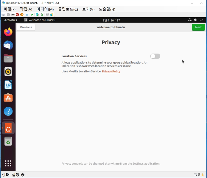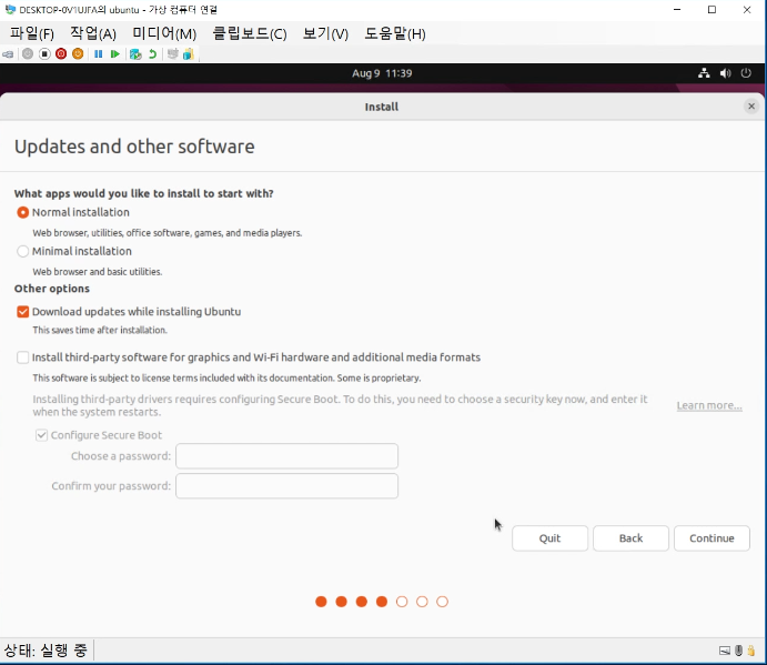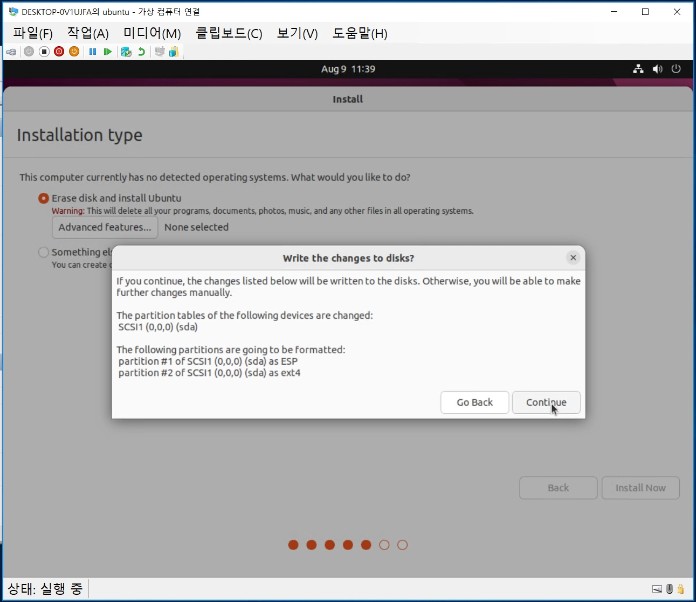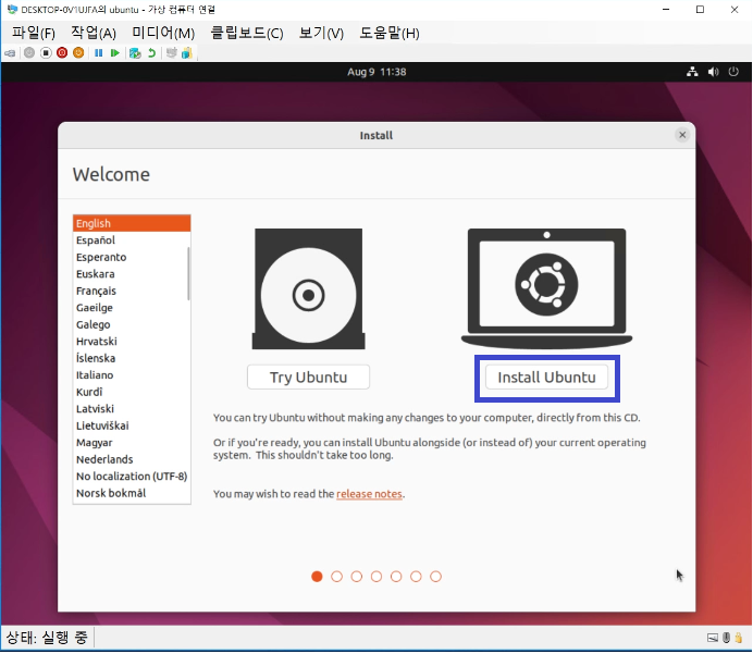 이제 가상 컴퓨터를 더블 클릭하고 시작하여 구동하여 ubuntu 설치를 진행한다.
