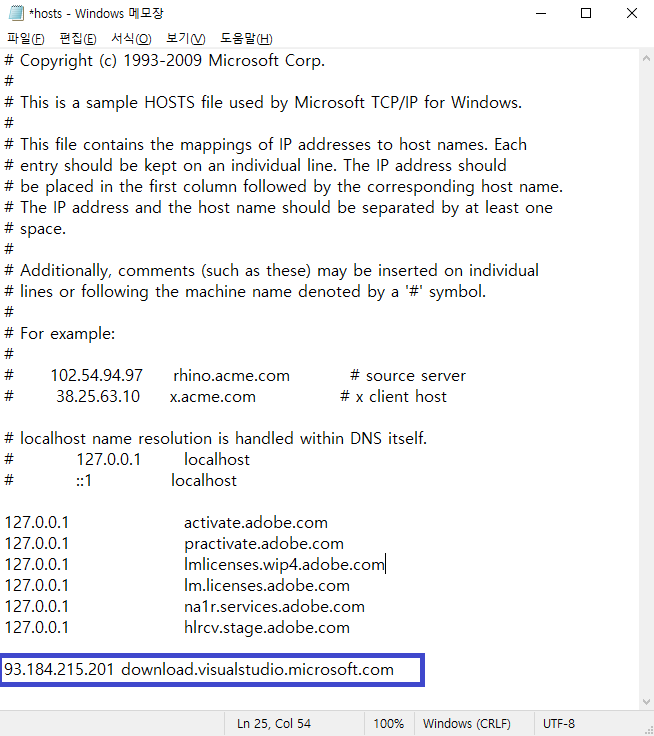 hosts 파일을 열린 메모장으로 엽니다.