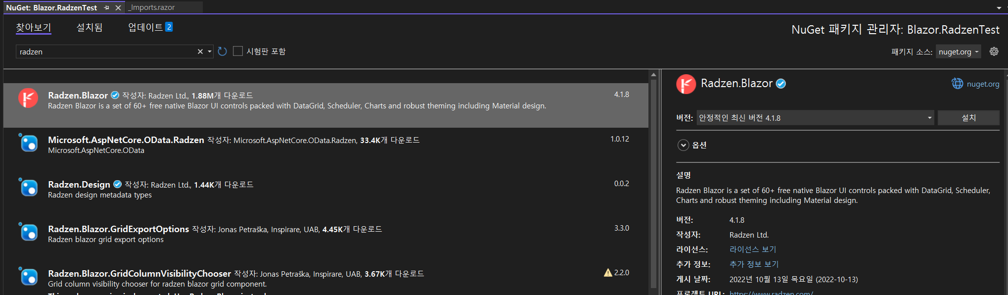 2. 'Radzen.Blazor' Nuget Package 설치