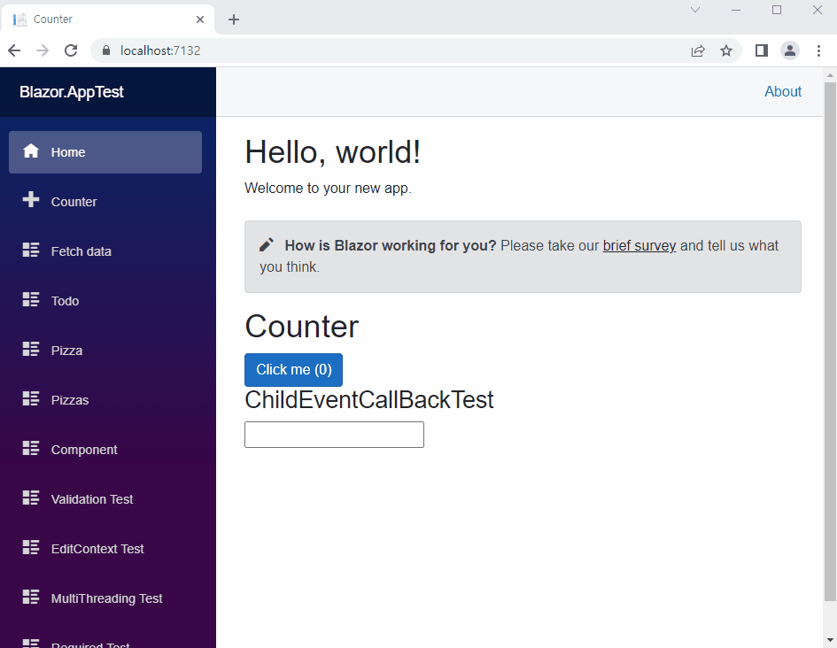 위처럼 ChildEventCallBackTest를 사용할 때 Parameter로 정의된 EventCallback 이벤트를 부모에 정의된 메서드와 연결하면 됩니다. (Enter 를 치면 부모에 값이 전달되어 표시됩니다.)