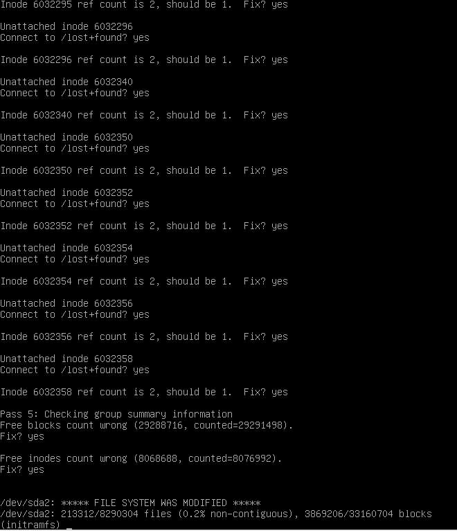 (initramfs) _해결방법은 아래의 명령을 실행하고 y 를 누르면 되는데 전부 y로 하려면 a 를 누르면 전부 y 로 처리된다.