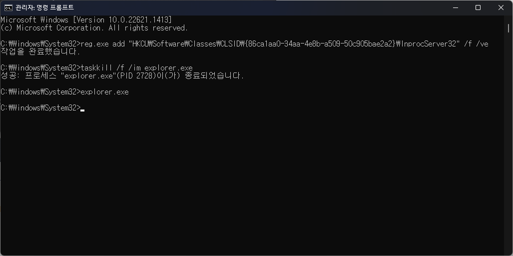 프롬프트 창에서 아래 명령을 차례대로 입력 후 Enter 합니다.