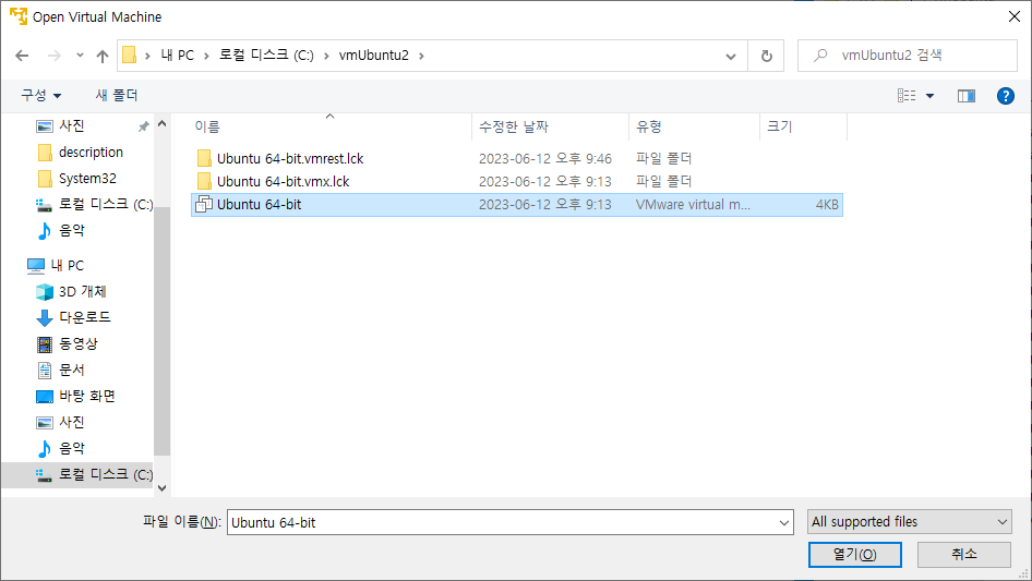 아까 복사했던 폴더에서 가상머신.vmx 파일을 선택합니다.