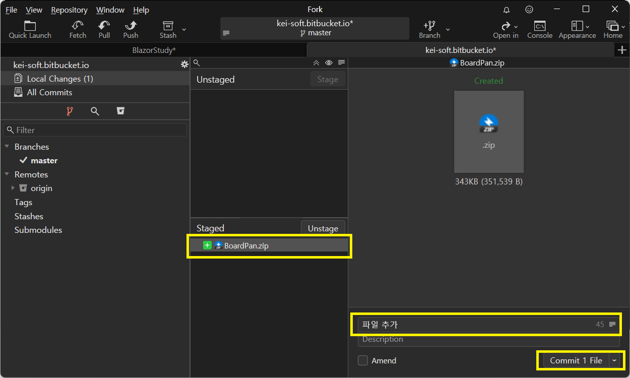 Fork Git Client 에서 Commit 하는 방법입니다.