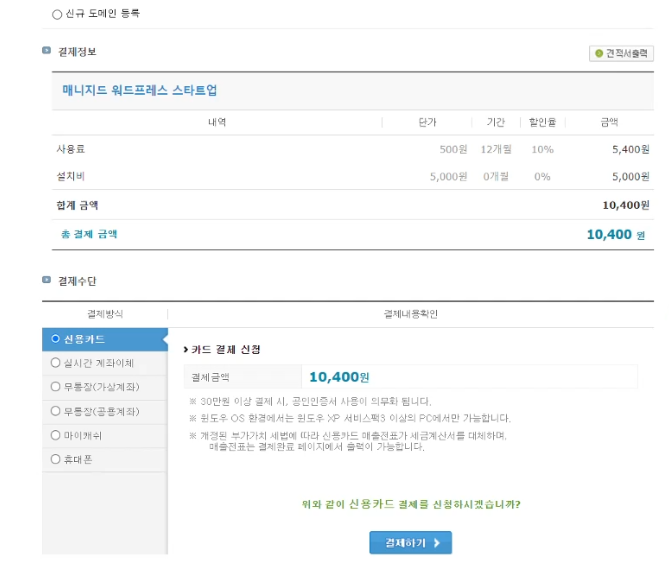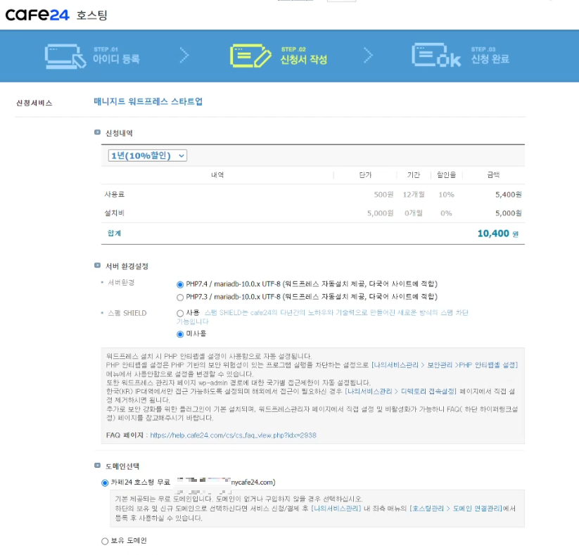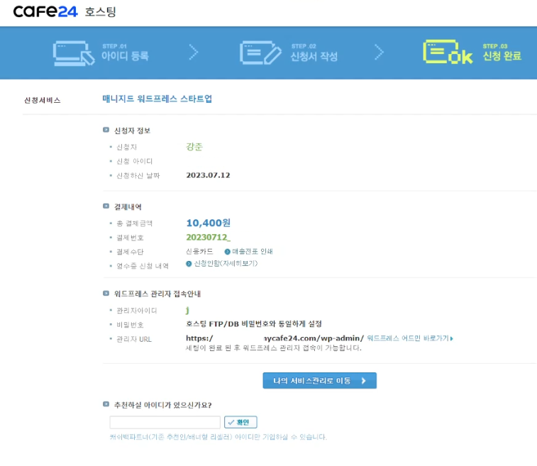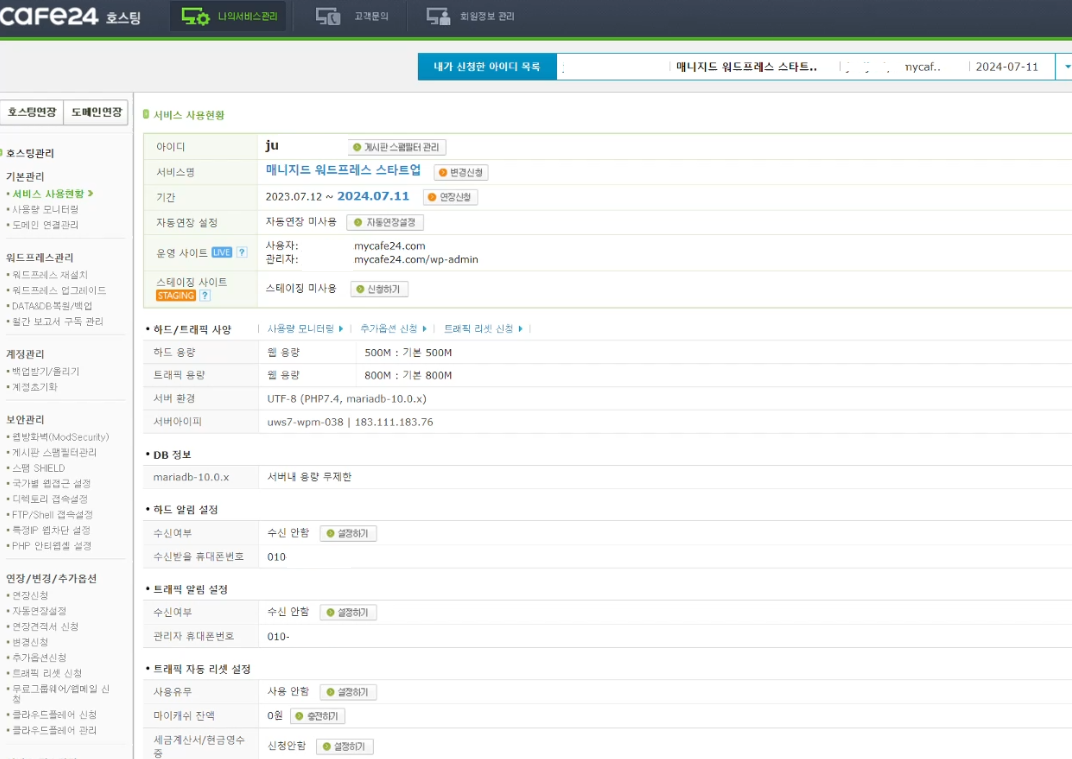 Cafe24에서 매니지드 워드프레스를 신청했습니다.