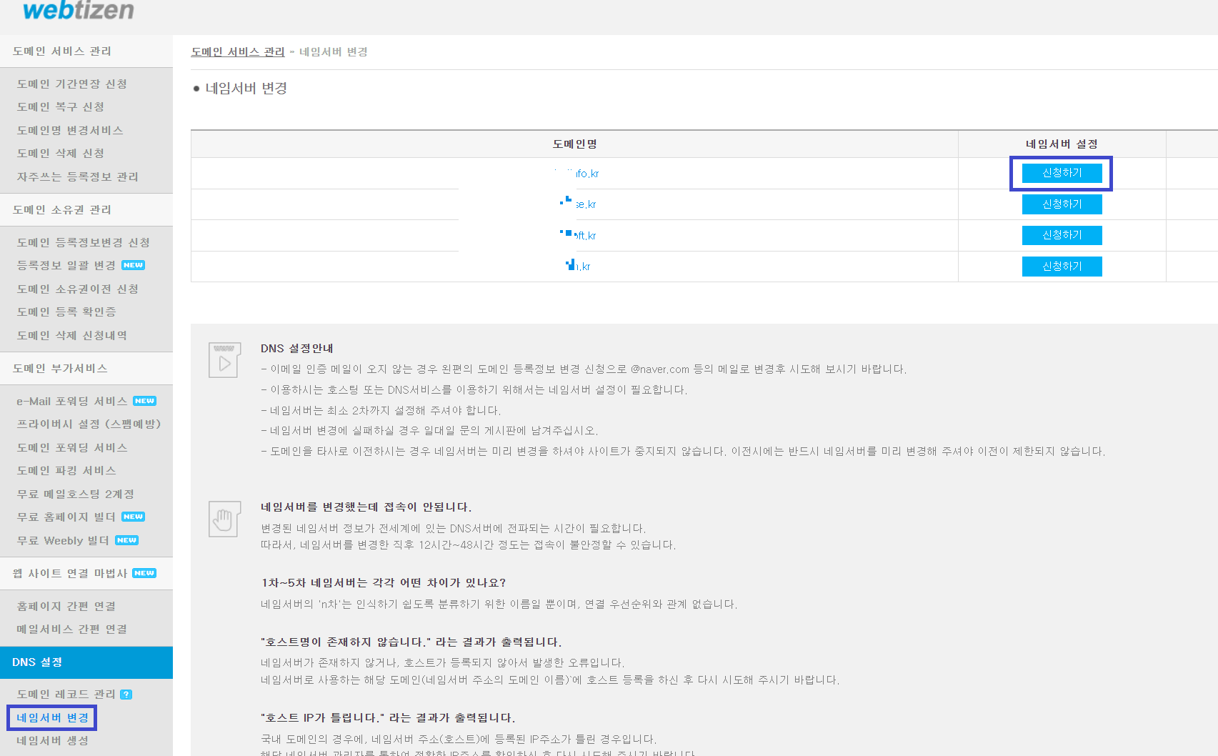 구입한 도메인명에 해당하는 신청하기 버튼을 클릭합니다.