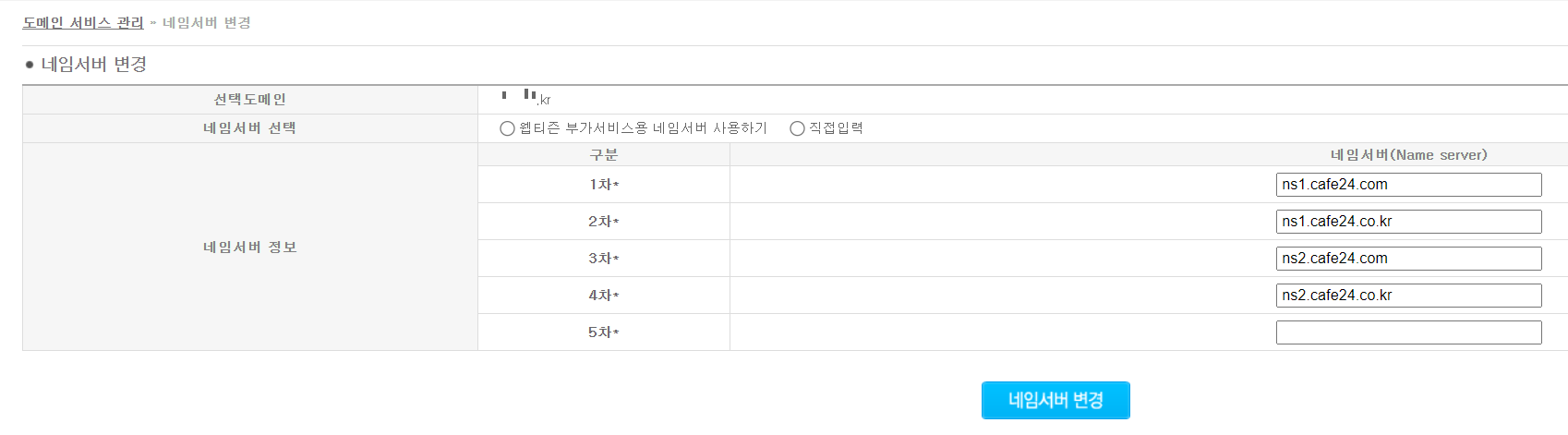 직접입력을 선택하고 Cafe24 에서 제공하는 네임서버를 적습니다.