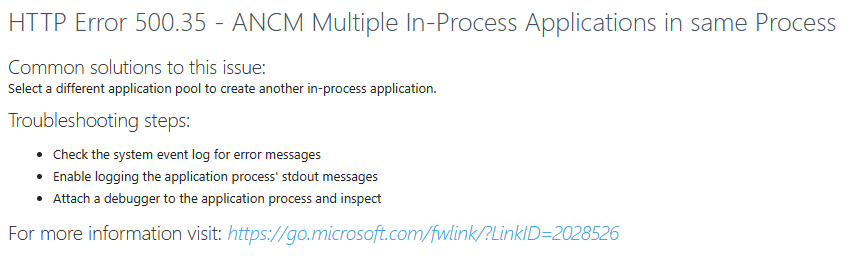 HTTP Error 500.35 - ANCM Multiple In-Process Applications in same ProcessCommon solutions to this issue:Select a different application pool to create another in-process application.Troubleshooting steps: