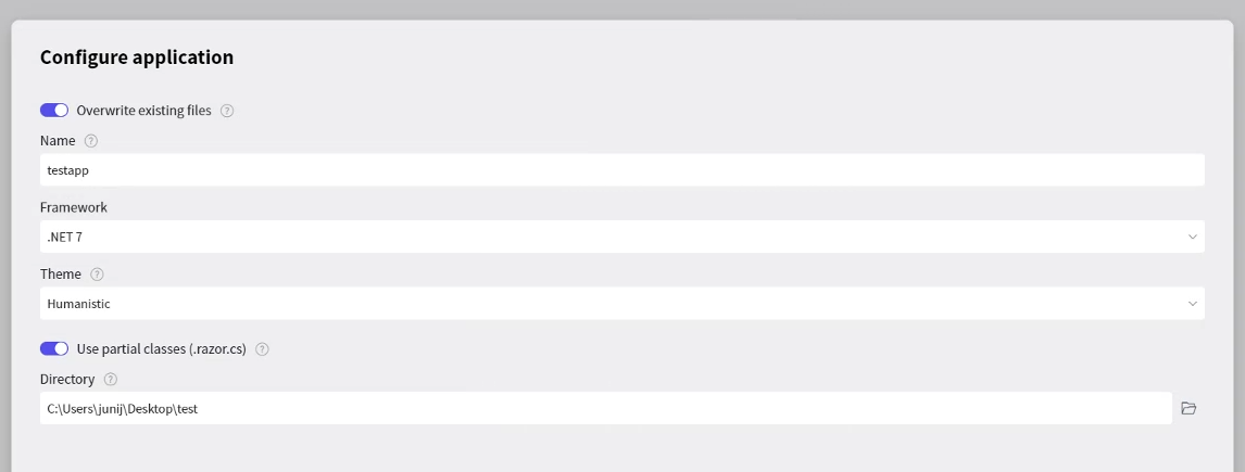 Generate page for CRUD operations 스위치를 on 하면 아래처럼 여러 타입의 CRUD 화면을 선택할 수 있습니다.