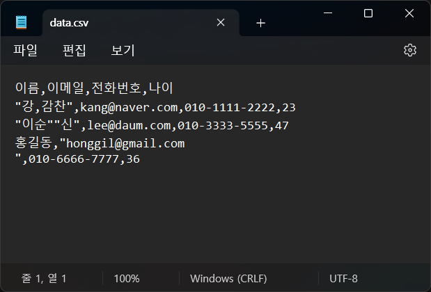 이를 사용하면 CSV 문자열에 ,(콤마)나 "(쌍따옴표), 개행문자 등도 처리할 수 있습니다.