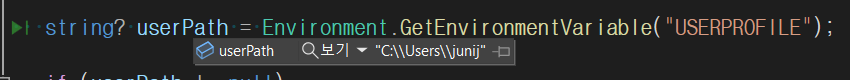 아래처럼 사용자 경로는 Environment.GetEnvironmentVariable 를 사용해 USERPROFILE을 찾으면 됩니다.