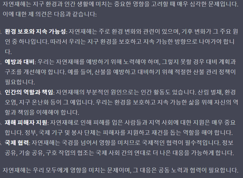 환경 보호와 지속 가능성: 자연재해는 주로 환경 변화와 관련이 있으며, 기후 변화가 그 주요 원인 중 하나입니다. 따라서 우리는 지구 환경을 보호하고 지속 가능한 방향으로 나아가야 합니다.