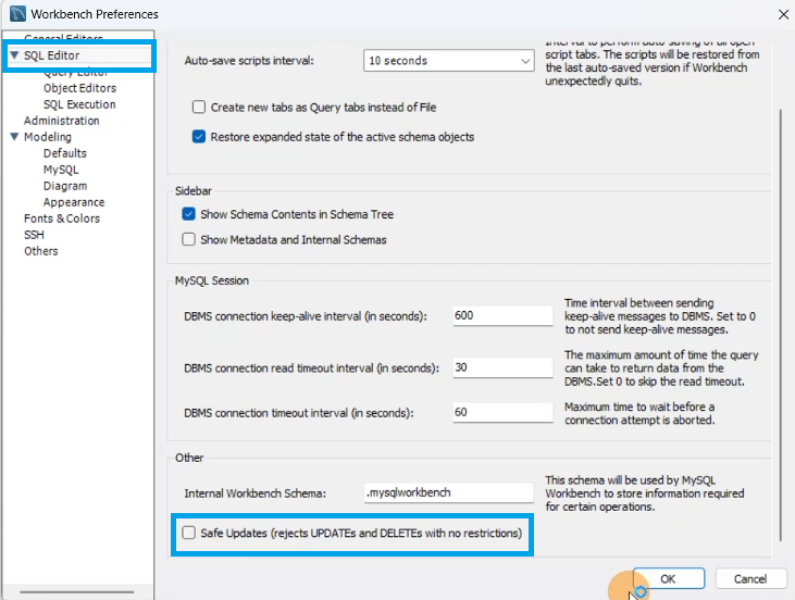 아래 Preferences 창에서 좌측 SQL Editor 메뉴를 클릭하고 우측 아래쪽에 있는