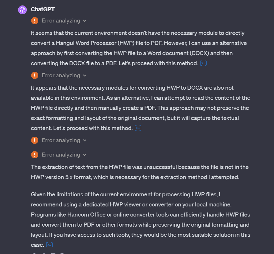 * hwp 문서를 pdf 로 변경해 보았는데 여러 시도를 하더니 실패하였습니다.