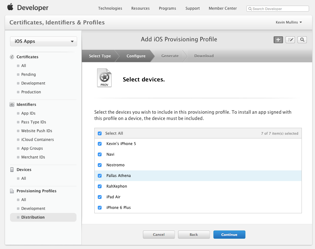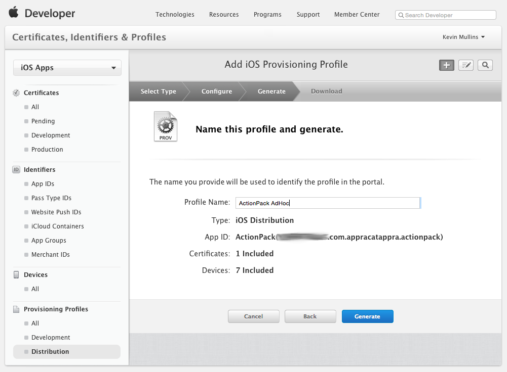 개발 프로비전 프로필에 사용한 것과 동일한 앱 ID 및 디바이스를 선택할 수 있지만, 아직 없는 경우 앱 스토어에 앱을 제출할 때 조직을 식별하기 위한 배포 인증서를 만들어야 합니다. 배포 인증서를 만드는 방법에 대한 단계는 아래 섹션에서 설명합니다.