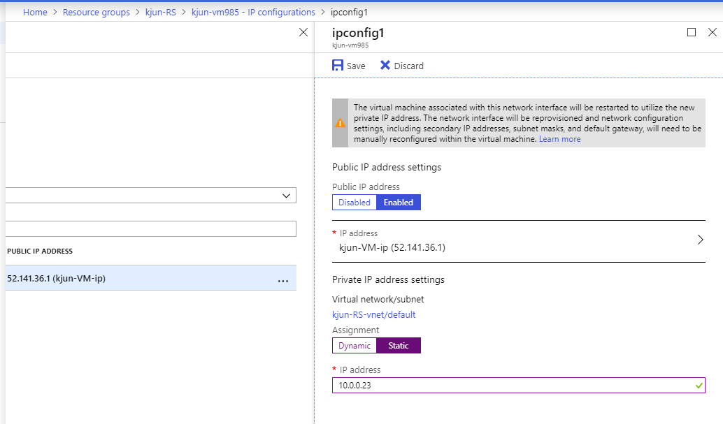 (단, 가상 네트워크단에서 설정한 subnet 범위안에서만 설정이 가능하다.)